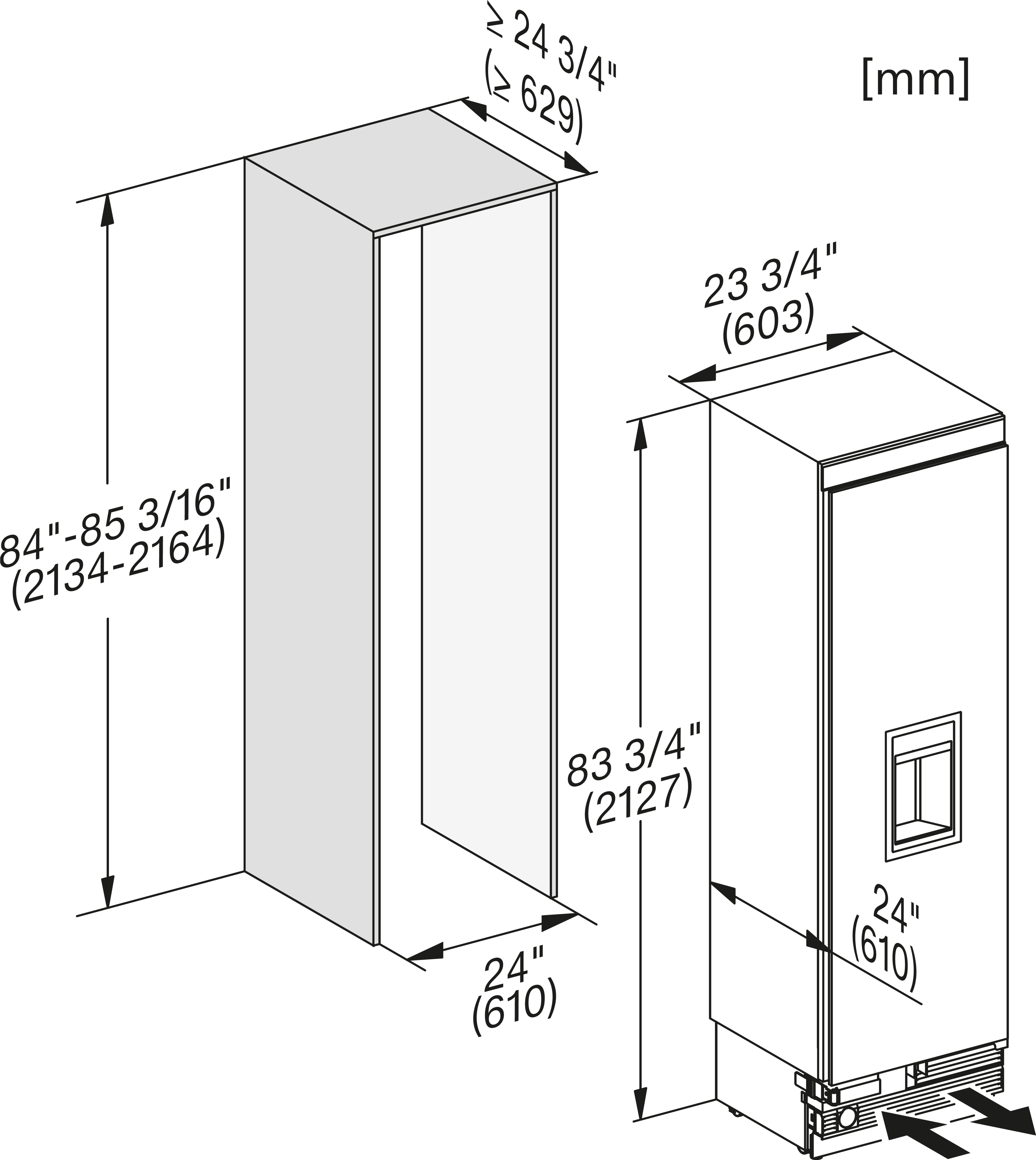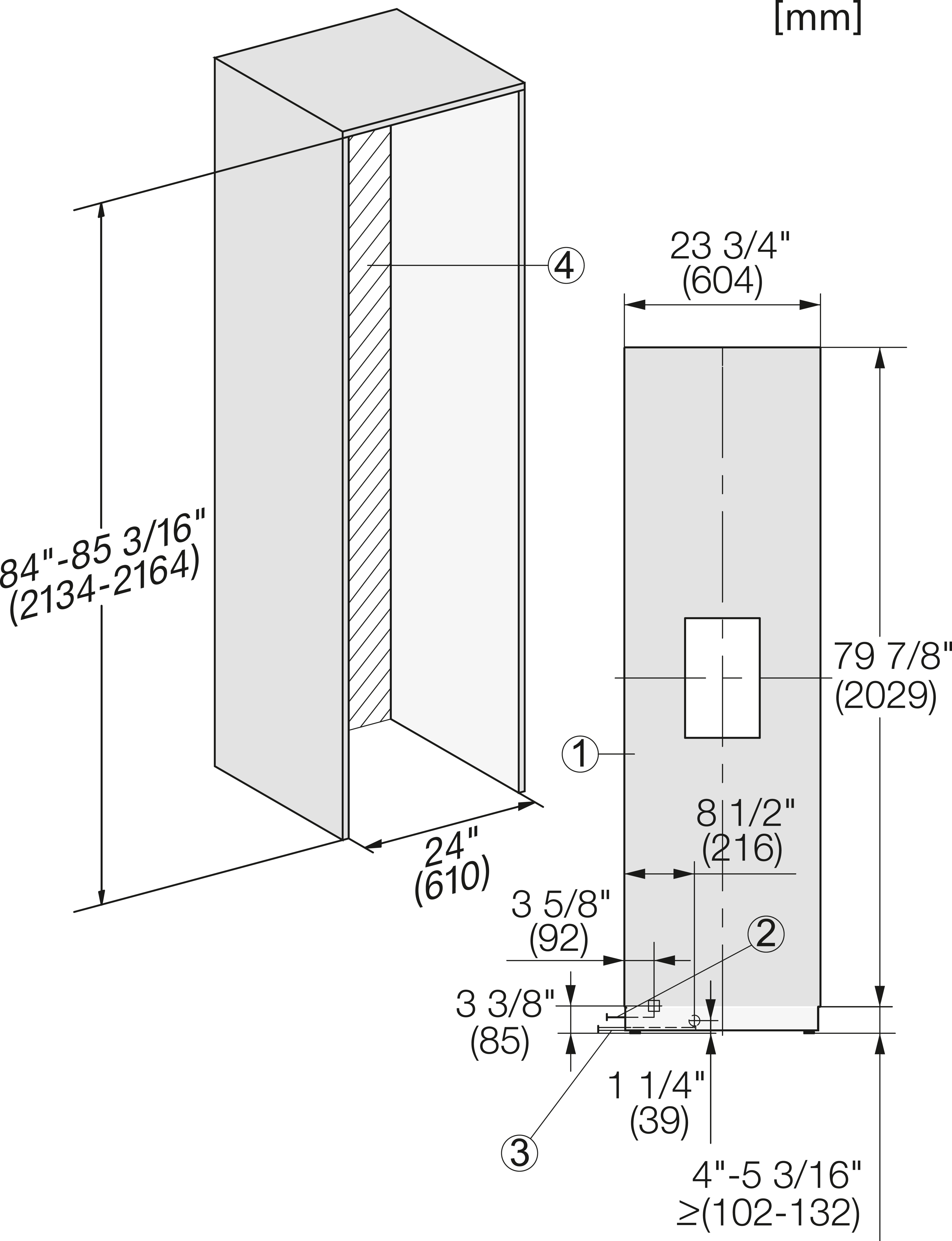Габариты ниши: 610-613 x 2,134-2,164 x 629 мм