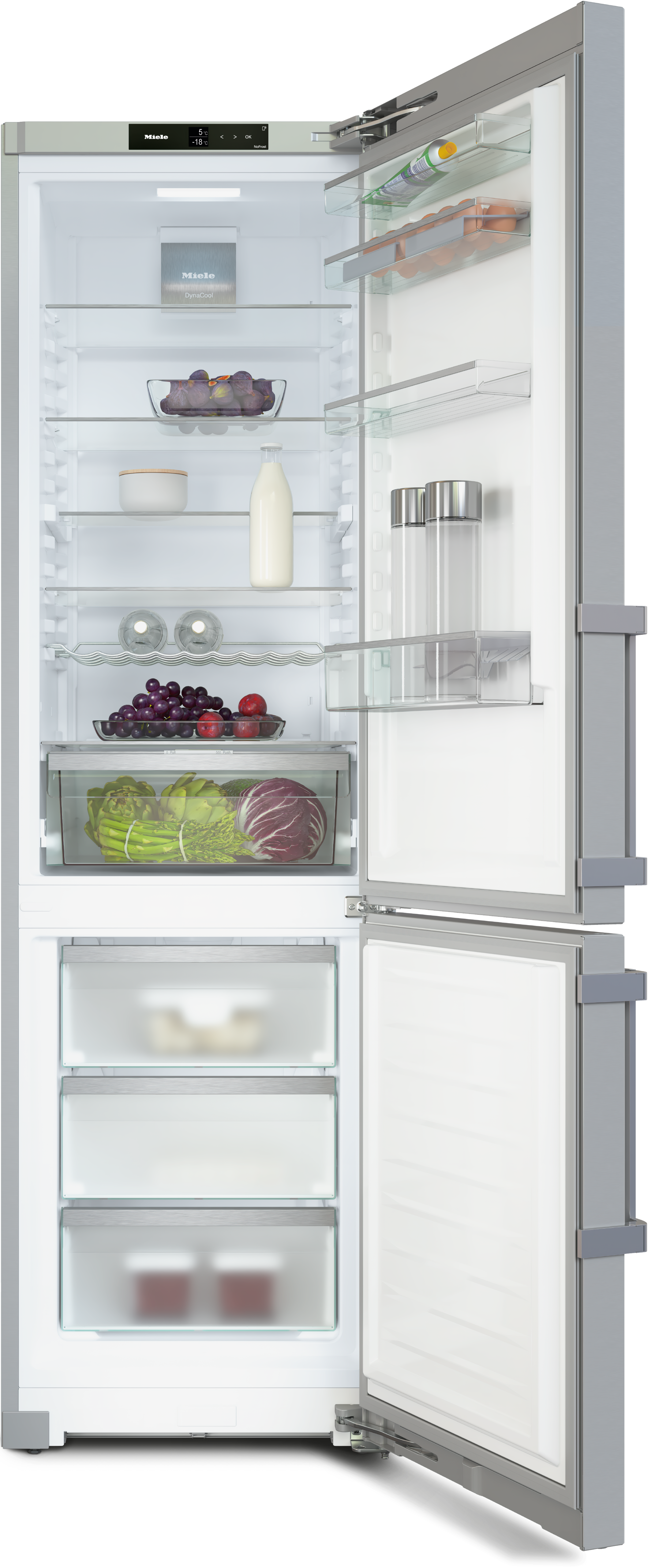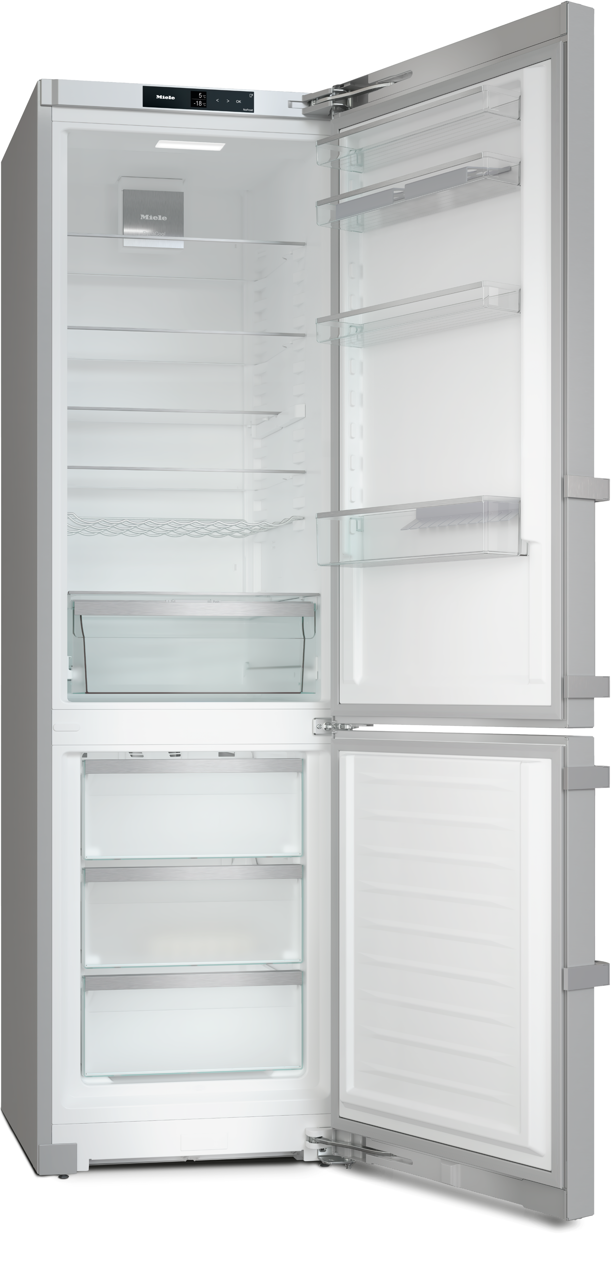 Отдельно стоящая комбинация холодильника с морозильной камерой с функциями DailyFresh, NoFrost, DynaCool и дополнительным удобством.