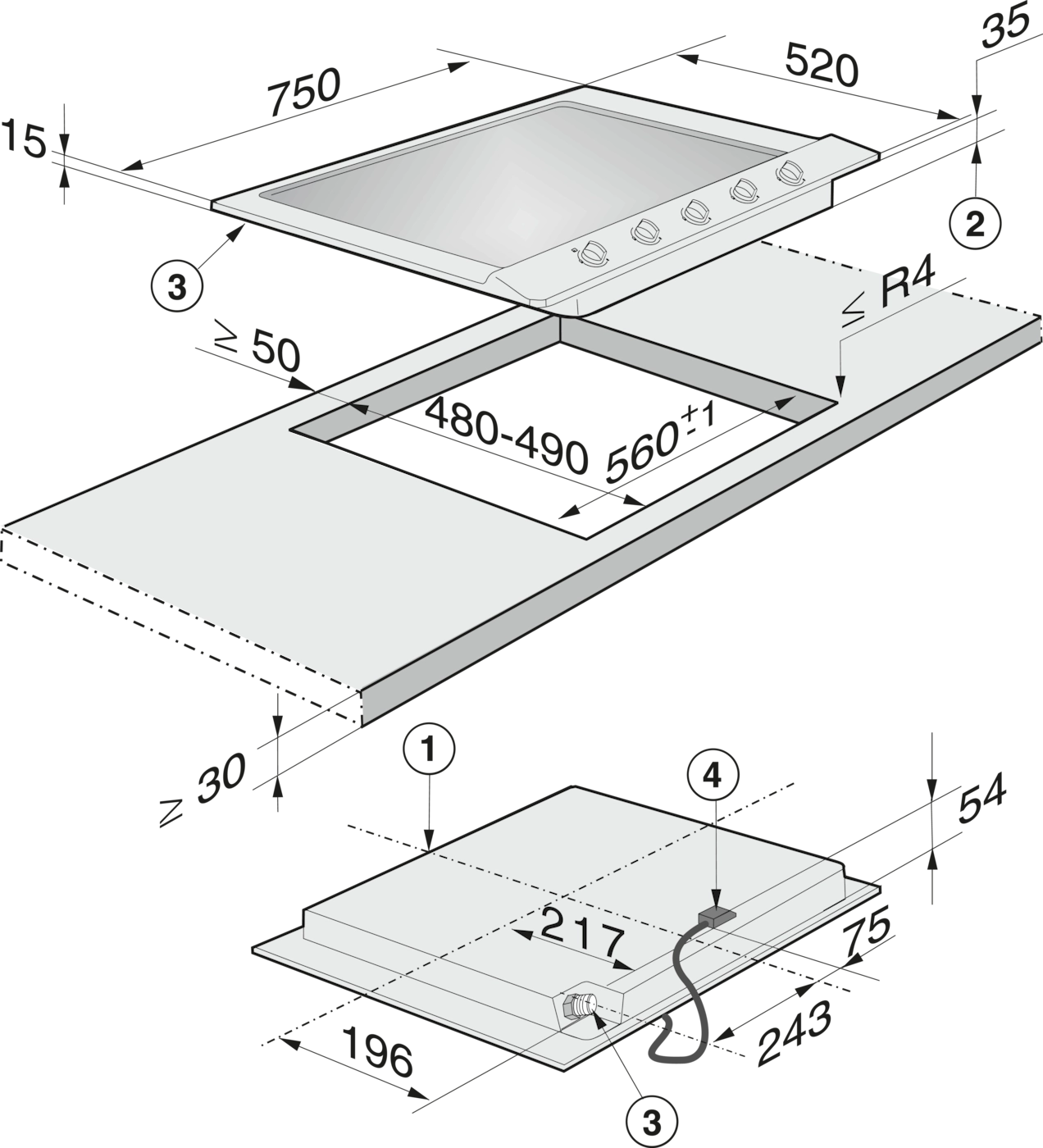 Панель газовых конфорок с 5 конфорками для удобного приготовления разнообразных блюд.