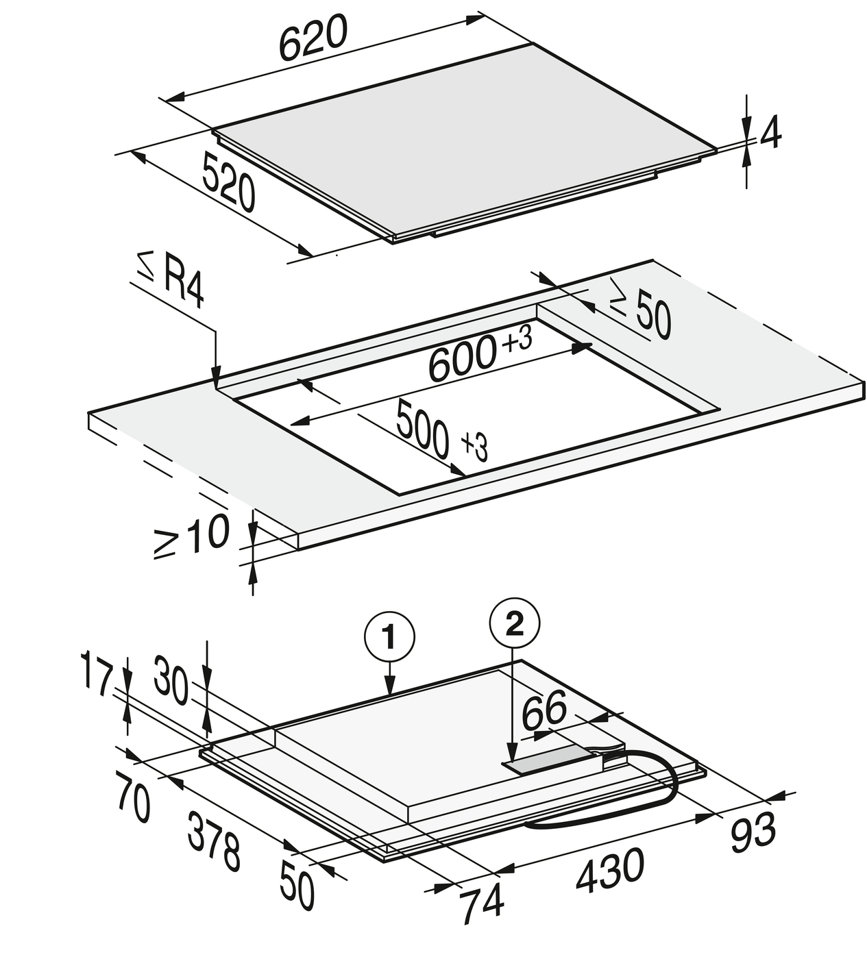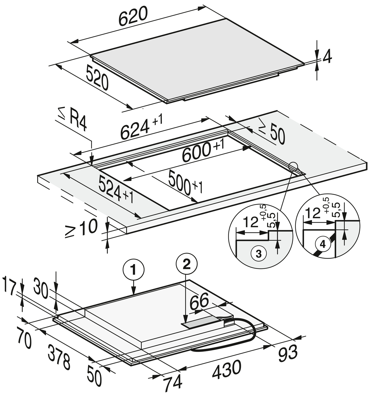 или 600/624 x 500/524 (вырез ступенькой при встраивании заподлицо) мм