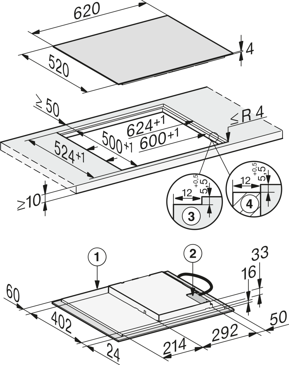 Внутренние размеры выреза в мм (ширина) для встраивания заподлицо