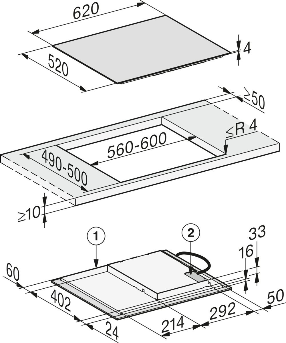 Внутренние размеры выреза в мм (глубина) для встраивания заподлицо