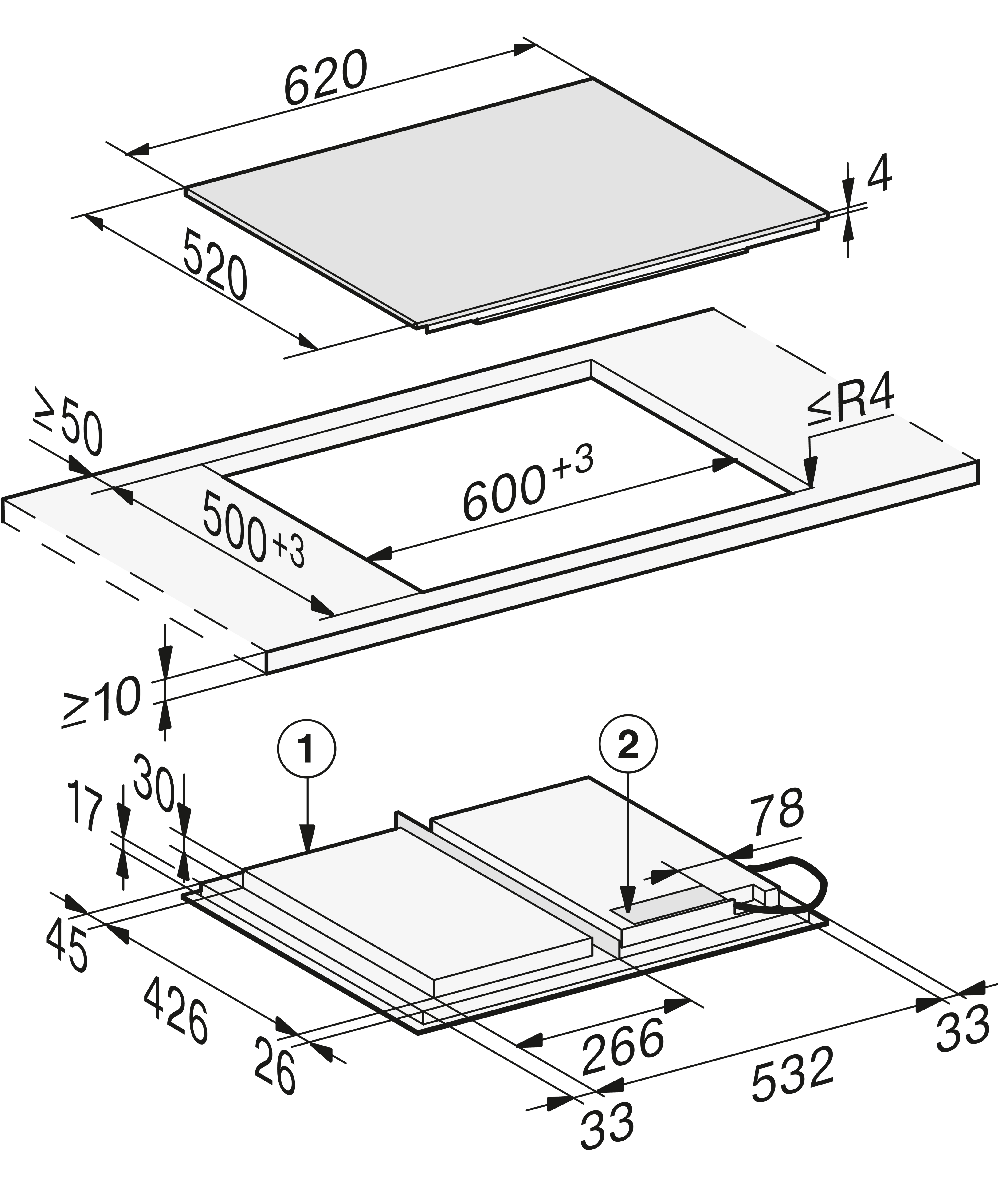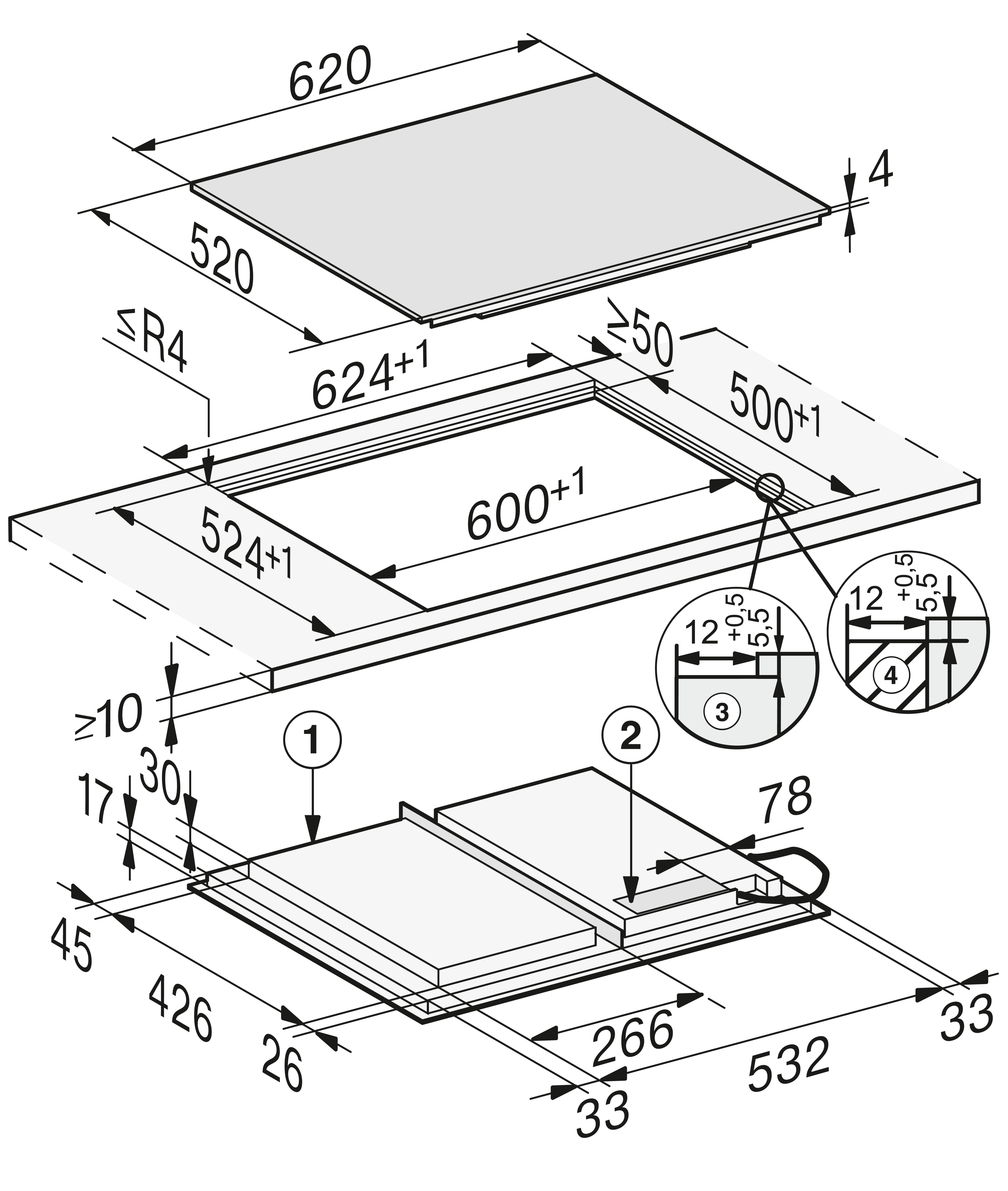 Внутренние размеры выреза в мм (глубина) для встраивания заподлицо