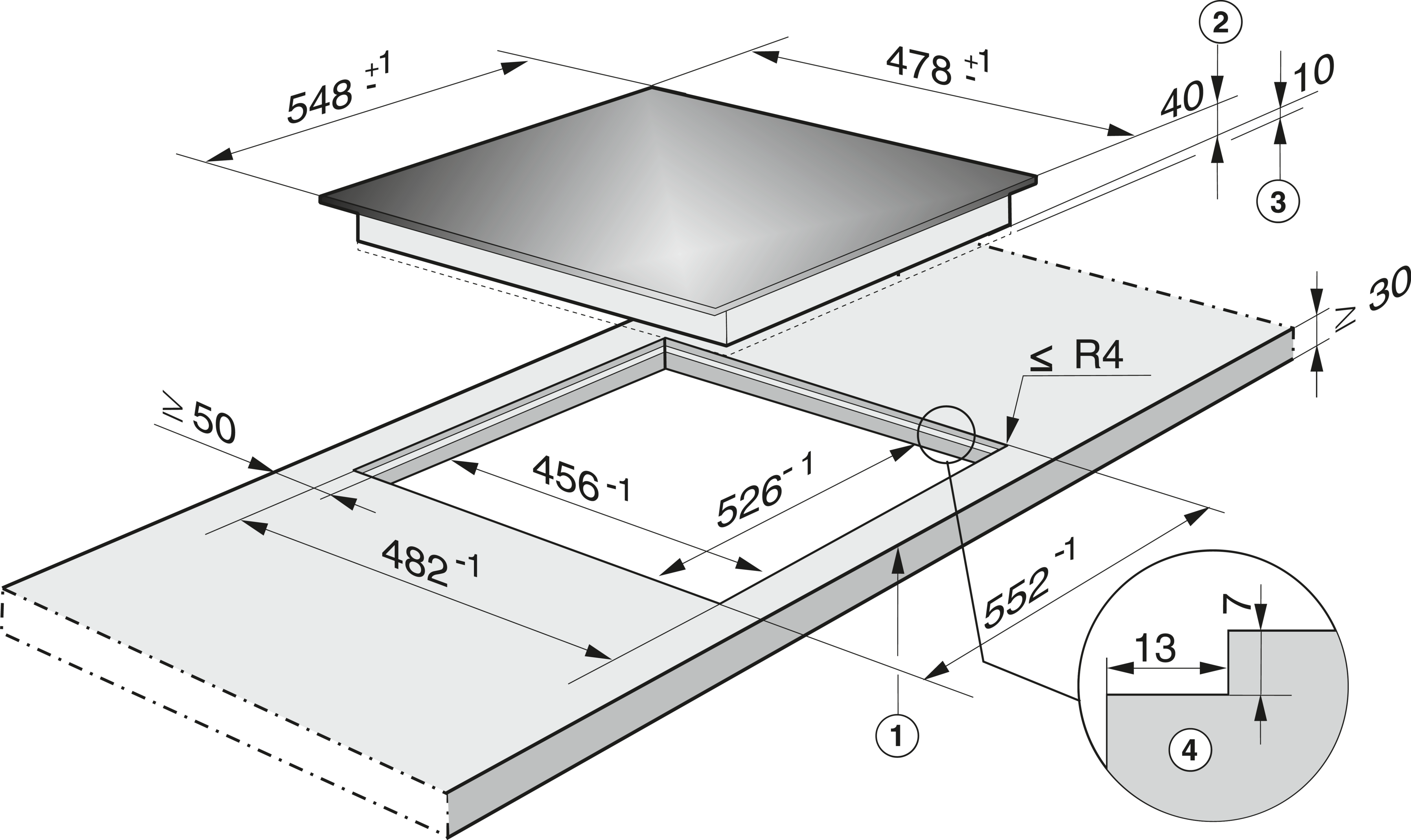 Внутренние размеры выреза в мм (ширина) для встраивания заподлицо