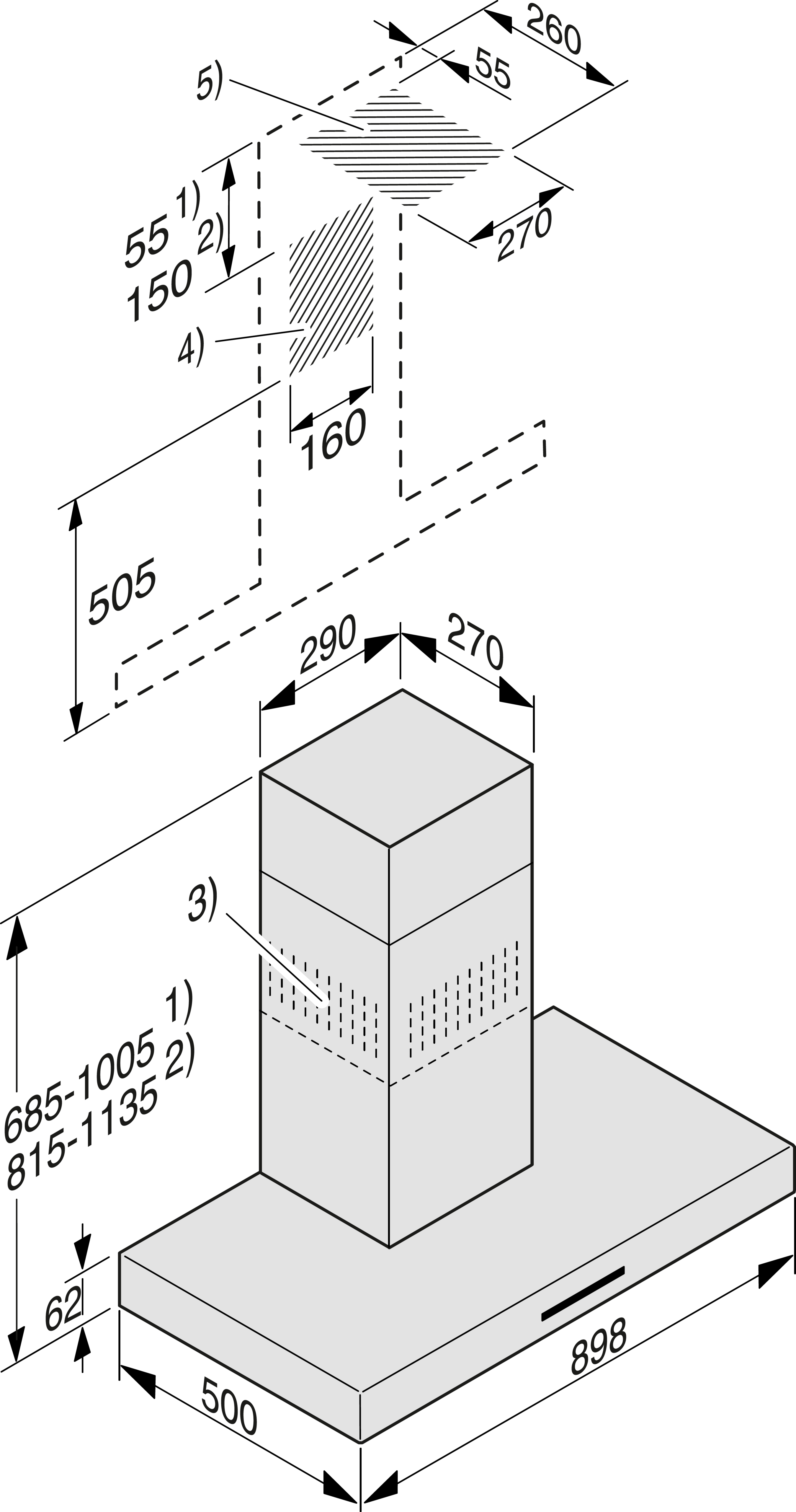 Общая высота вытяжки для режимов отвода воздуха и отвода с выносным вентилятором минимально (мм)