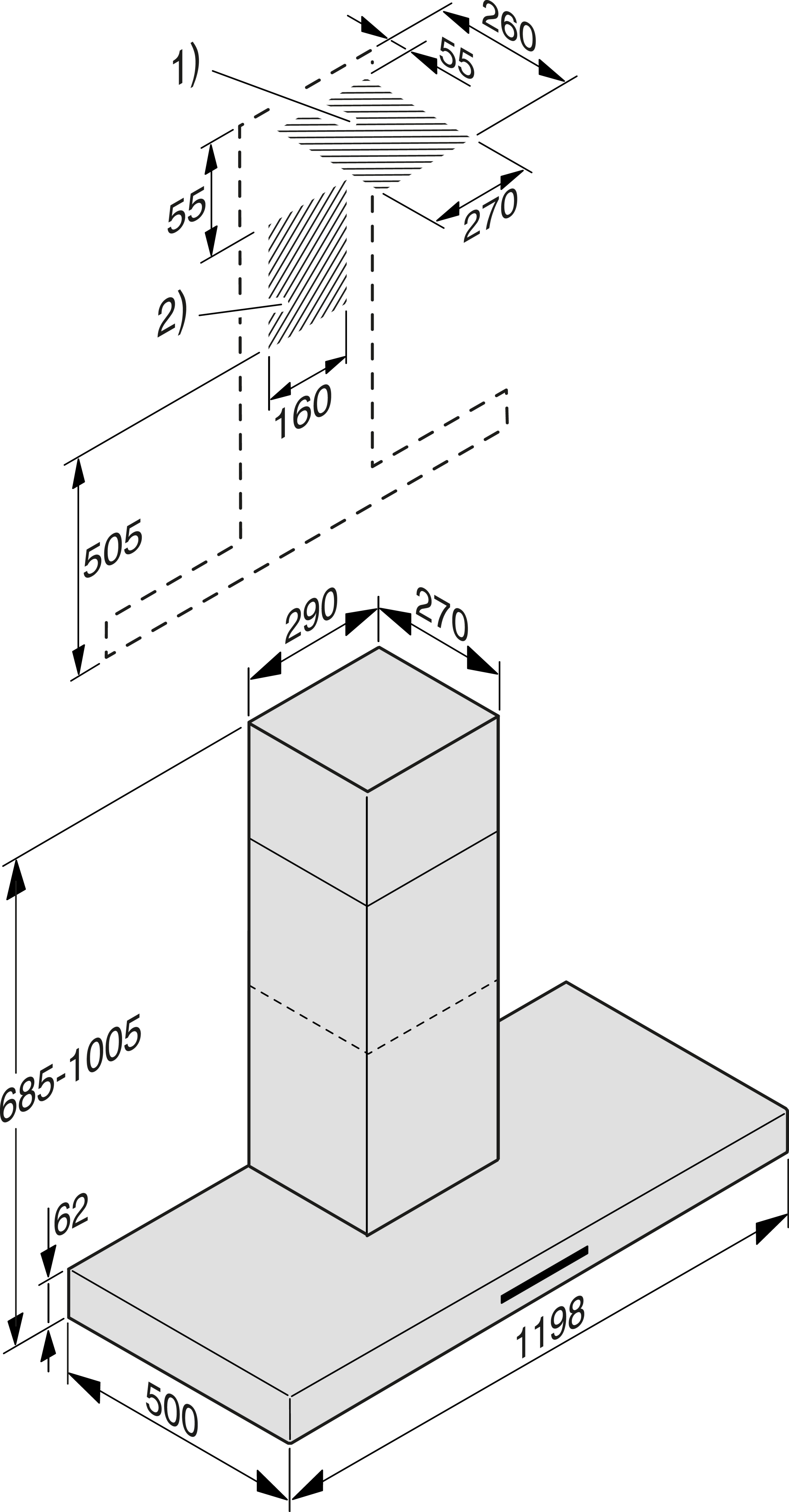 Общая высота вытяжки для режимов отвода воздуха и отвода с выносным вентилятором минимально (мм)