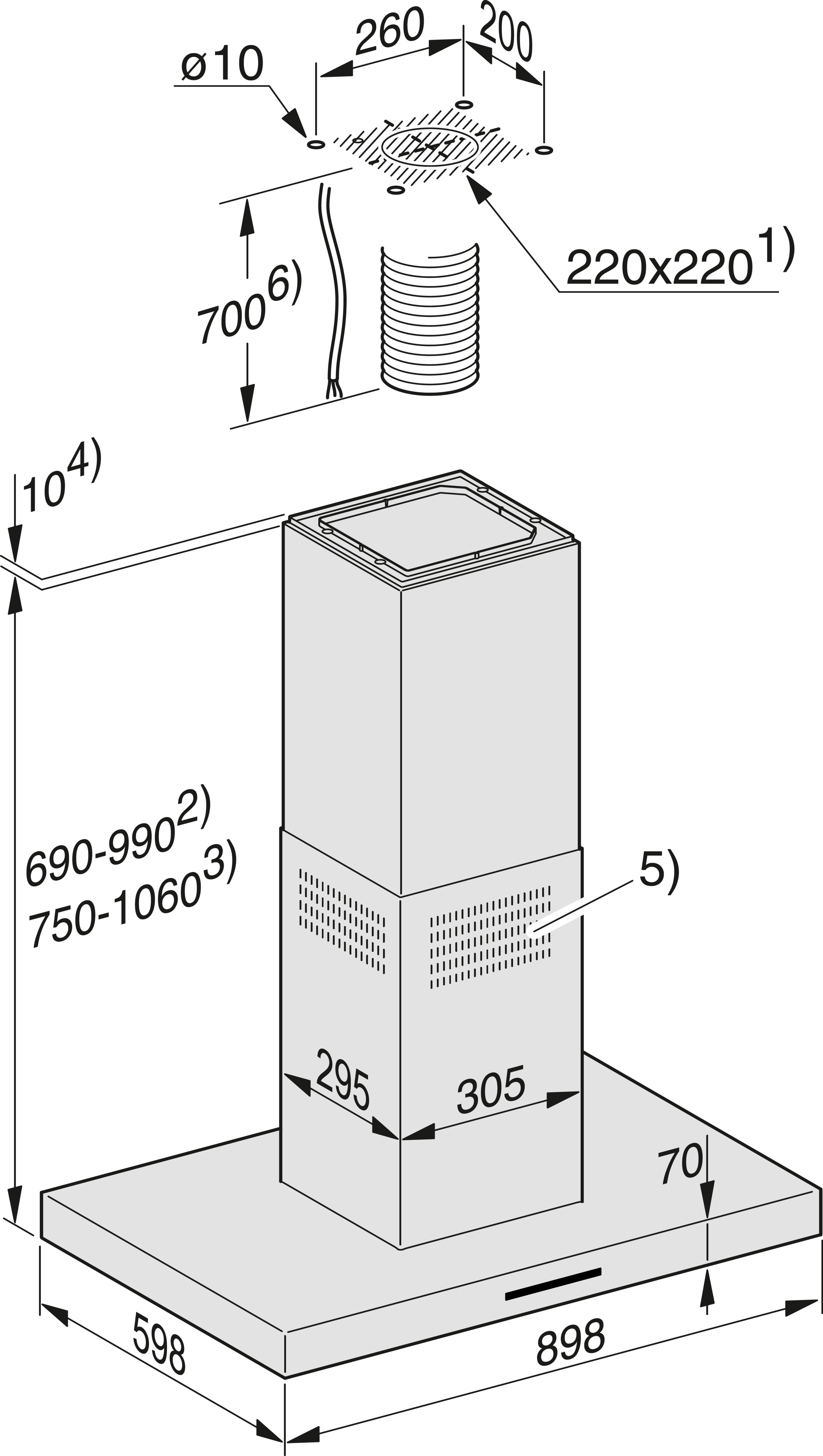 Общая высота вытяжки для режимов отвода воздуха и отвода с выносным вентилятором минимально (мм)