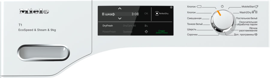 T1, сушильная машина с тепловой помпой: Функции SteamFinish, DryCare 40 и SilenceDrum – для деликатной сушки.